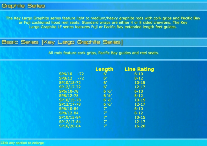 The Key Largo Graphite series feature light to medium/heavy graphite rods with cork grips and Pacific Bay