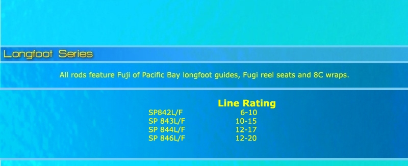All rods feature Fuji of Pacific Bay longfoot guides, Fugi reel seats and 8C wraps.