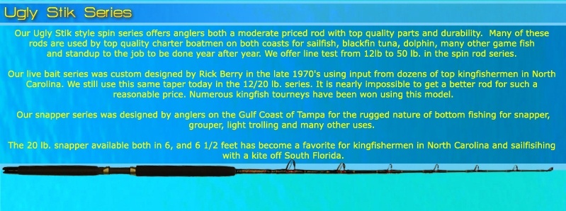 and standup to the job to be done year after year. We offer line test from 12lb to 50 lb. in the spin rod series.